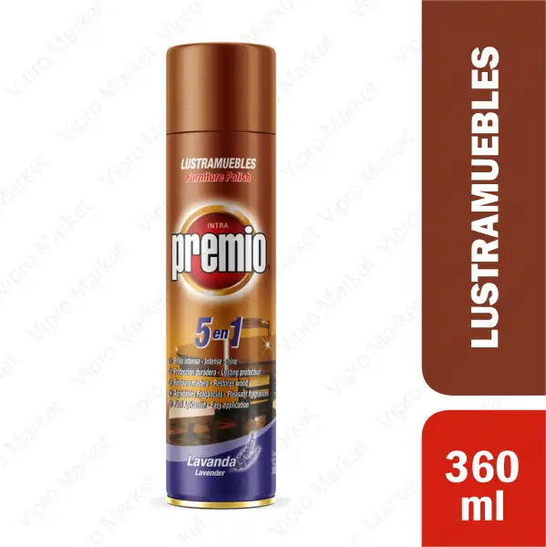 El Aerosol Protector Lustramuebles Premio está formulado con siliconas, ceras nobles y finos solventes que limpian, dan brillo y protegen tus muebles. Su presentación en spray facilita su aplicación, y su aroma a lavanda dejará un agradable perfume en el ambiente. Recuerda agitar bien el producto antes de usarlo, limpiar la superficie de polvo y rociarlo a una distancia de 25 cm. Frota ligeramente con una franela limpia hasta lograr el brillo deseado.