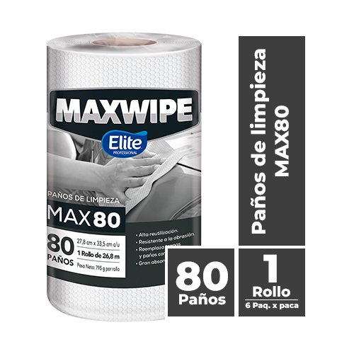 Paños de Limpieza Elite Maxwipe X80 (80 paños). Es un producto de limpieza industrial reutilizable diseñado para trabajos pesados que requieren una alta resistencia y absorción.